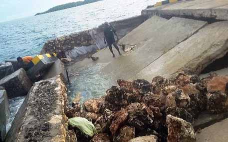 Seperti disaksikan di lokasi kerusakan, sejumlah kubus-kubus beton memang telah ditempatkan di bagian terdepan. Kubus-kubus itu dipindahkan dari atas pelabuhan dengan menggunakan alat berat. Selain itu nampak sejumlah pekerja merapikan tumpukan batu gunung yang ditimbun di lokasi kerusakan pelabuhan yang baru selesai dibangun dan dikembangkan tahun 2015 lalu dengan dana APBN senilai lebih dari Rp. 190 miliar itu.(ion)