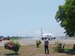 Waingapu.Com-Dua semprotan air (Water Salute) melengkung indah dari mobil pemadam kebakaran menyambut pesawat yang baru saja mendarat di Bandara Umbu Mehang Kunda, Senin (6/10/2025). Air itu bukan sembarang air, tapi simbol penyambutan atas kembalinya konektivitas udara ke Sumba Timur yang akan diembanoleh Sriwijaya Air.