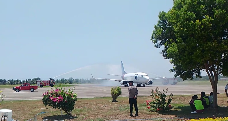 Pesawat bermesin jet dengan nomor penerbangan ETA SJ 740 itu mendarat mulus sekitar pukul 11.00 Wita. Dalam penerbangan perdana ini turut serta Direktur Utama Sriwijaya Air Jefferson Irwin Jauwena dan Direktur Niaga.